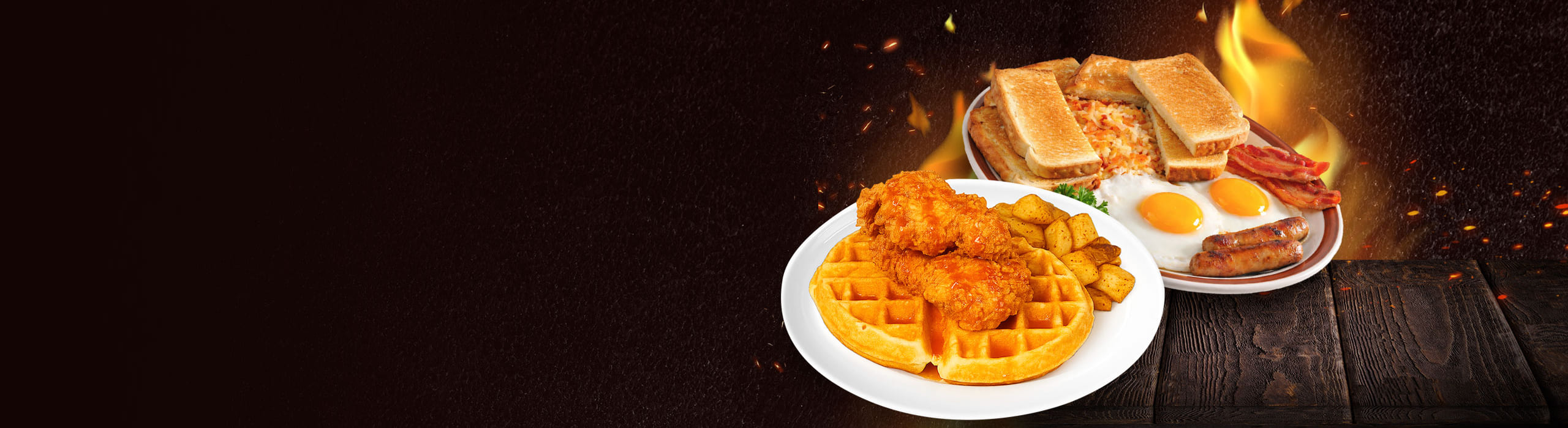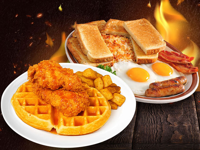 One Belgian waffle topped with 3 piece crispy chicken tenders or 4 piece wing dings. Served with skillet potatoes, butter, and syrup