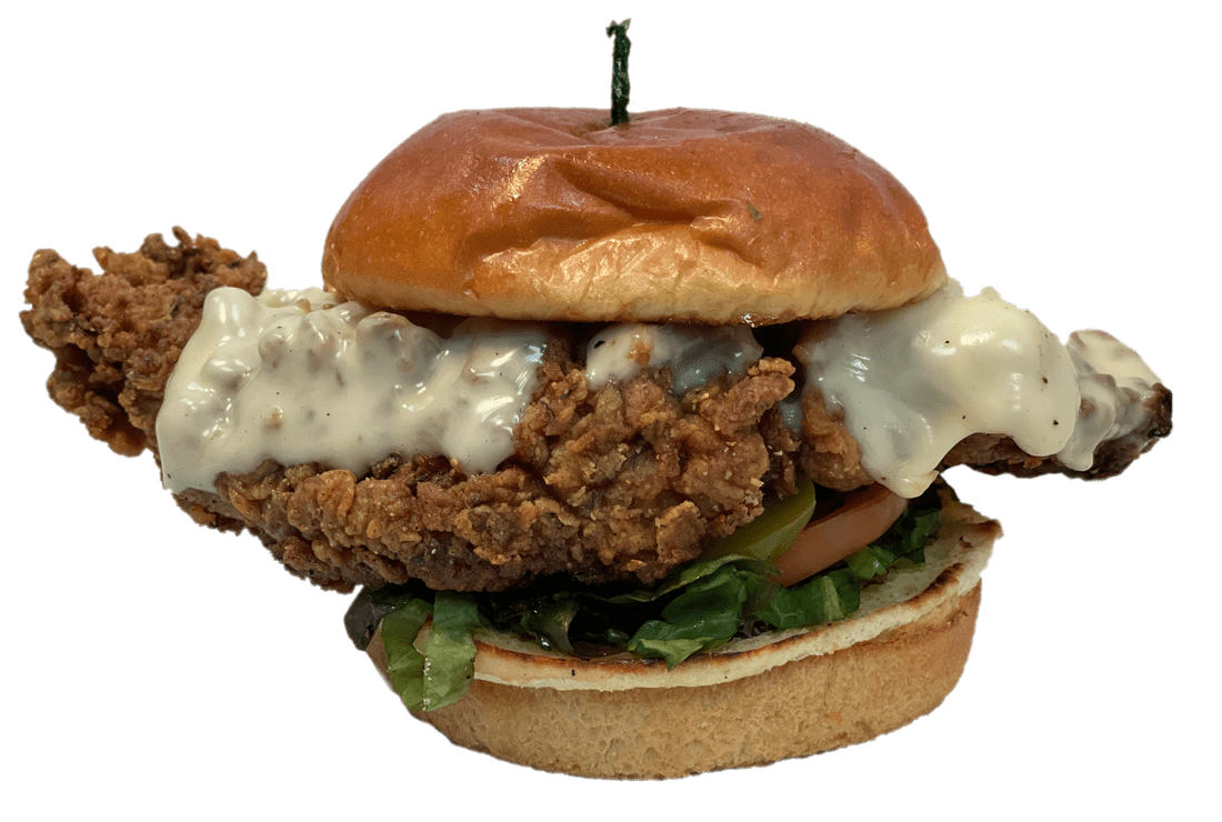 Signature Chicken Sandwich 8 oz. marinated chicken breast and deep fried. With pickles, lettuce, spicy sauce on a brioche bun.